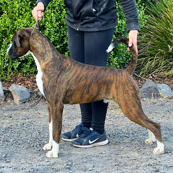 Marcus is proven at stud. He has produced fawns and brindles and his baby daughter, Kesdar Ode To Winter (Soli) is close to her title and has won Multiple BEST PUPPY IN SHOW awards.