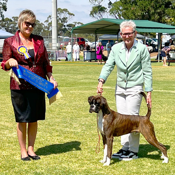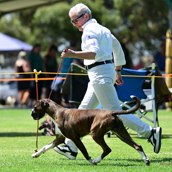 Kelly won Best in Show at the Boxer Association of Victoria Championship Show under breed specialist Ferelith Sommerfield, and multi Best of Breeds when the numbers of Boxers being shown was always up over 50 at any given weekend, including Royal Challenges and two Runner Up Best in Show awards.